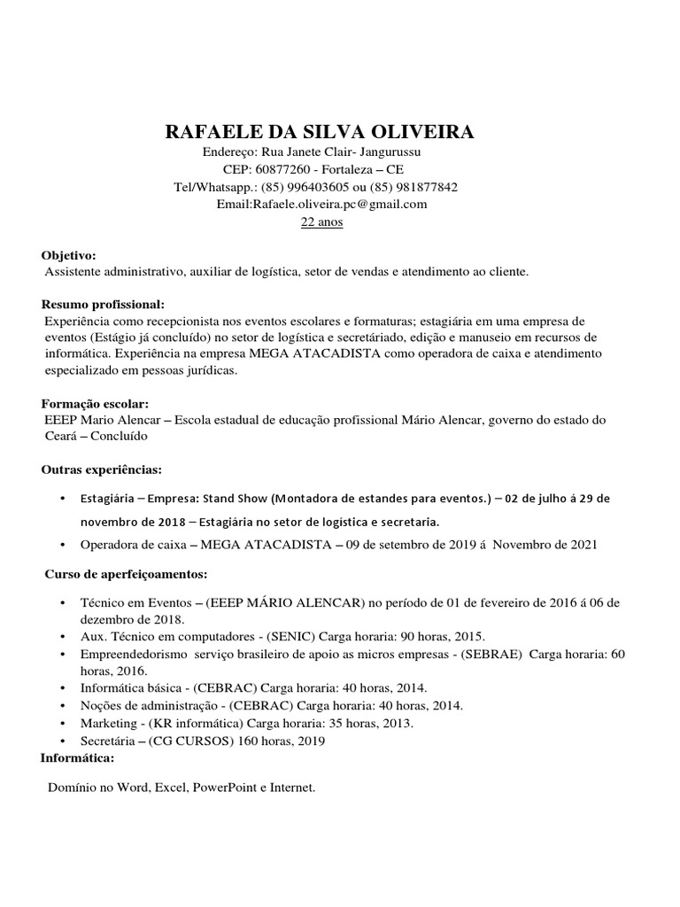 informática. Experiência na empresa MEGA ATACADISTA como operadora de caixa e atendimento