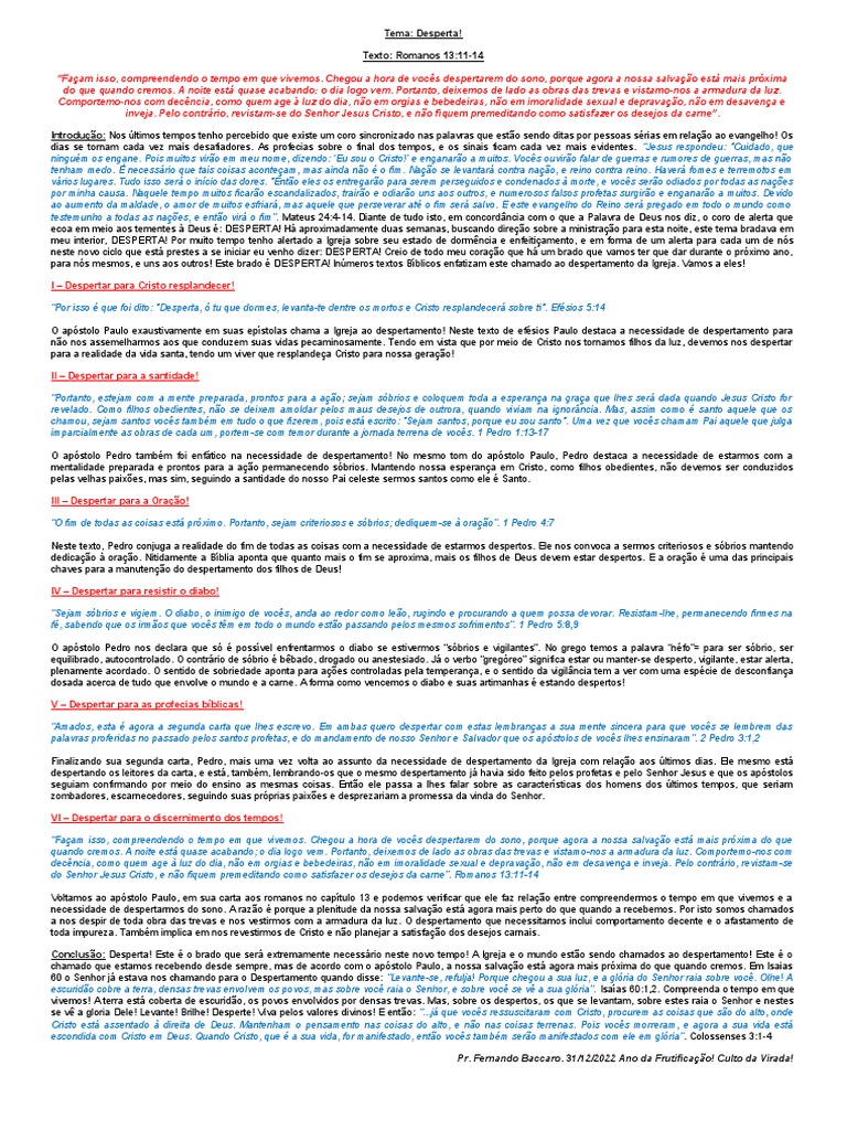 “Façam isso, compreendendo o tempo em que vivemos. Chegou a hora de vocês despertarem do sono, porque agora a nossa salvação está mais próxima do que