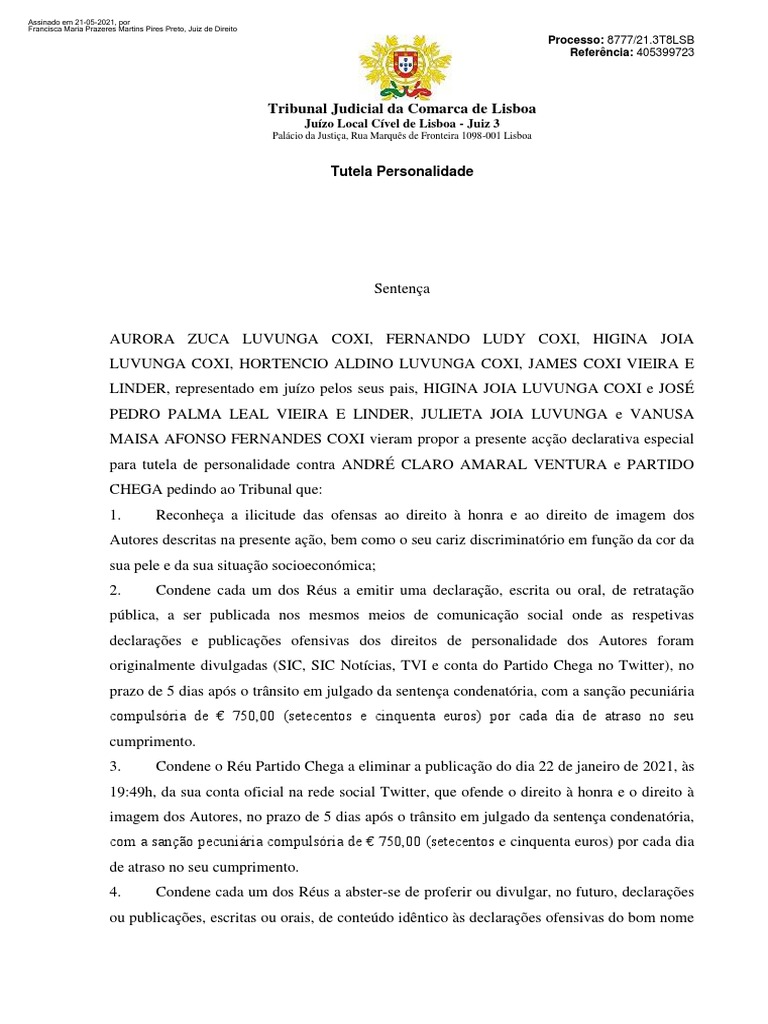 No que diz respeito à publicação da sentença na conta do partido Chega no Twitter, fixa-se