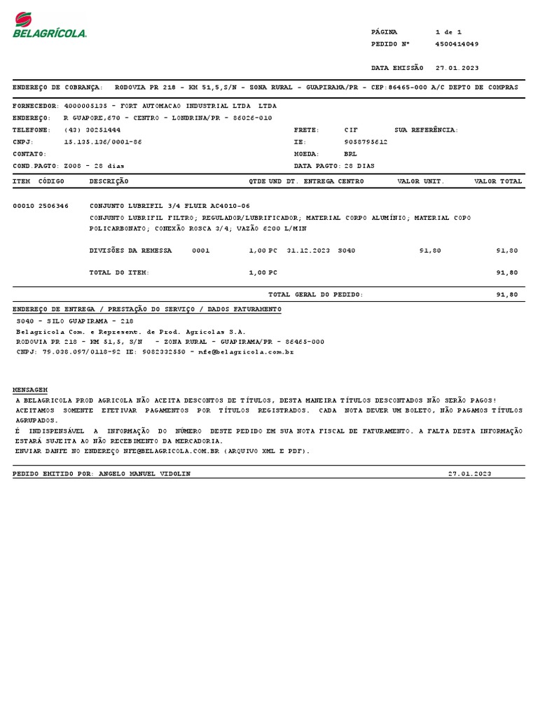 PEDIDO EMITIDO POR: ANGELO MANUEL VIDOLIN 27.01.2023