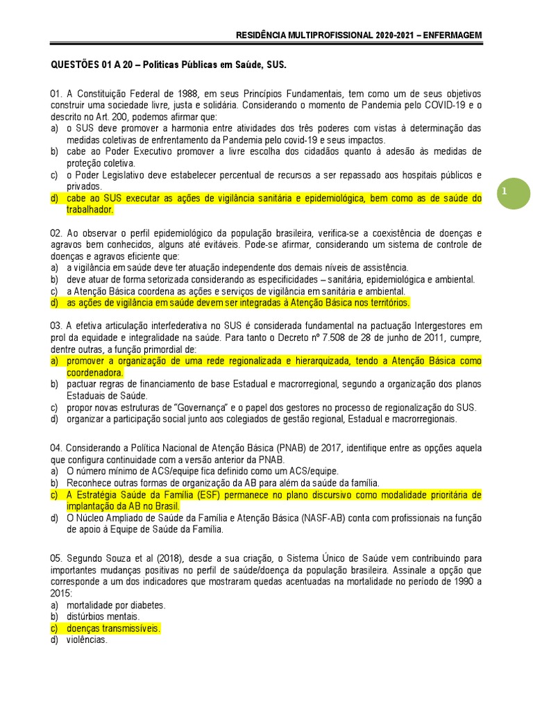 QUESTÕES 01 A 20 – Políticas Públicas em Saúde, SUS.