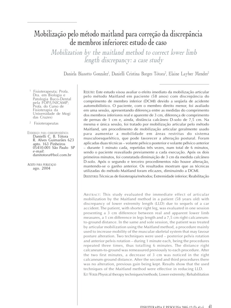 A BSTRACT: This study evaluated the immediate effect of articular mobilization by the Maitland method in a patient (58 years old) with discrepancy of lower extremity length (LLD) due to sequels of a car accident. The patient, with shorter right leg, was evaluated in one session presenting a 3 cm difference between real and apparent lower limb measures, a 1 cm difference in legs length and a 7,5 cm right calcaneumto-ground distance. In the same and sole session, the patient was treated by articular mobilization using the Maitland method, a procedure mainly used to increase mobility of the muscular-skeletal system that may favour posture alteration. Two techniques were used posterior pelvis rotation and anterior pelvis rotation during 1 minute each, being the procedures repeated three times, thus totalling 6 minutes. The distance right calcaneum-to-ground was remeasured previously to each procedure. After the two first minutes, a decrease of 3 cm was noticed in the right calcaneum-ground distance. After the second and third procedures there was no alteration, previous gain being kept. Results show that the used techniques of the Maitland method were effective in reducing LLD. KEY WORDS: Physical therapy techniques/methods; Lower extremity; Rehabilitation