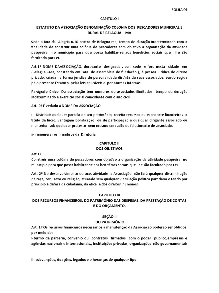 ESTATUTO DA ASSOCIAÇÃO DENOMINAÇÃO COLONIA DOS PESCADORES MUNICIPAL E
