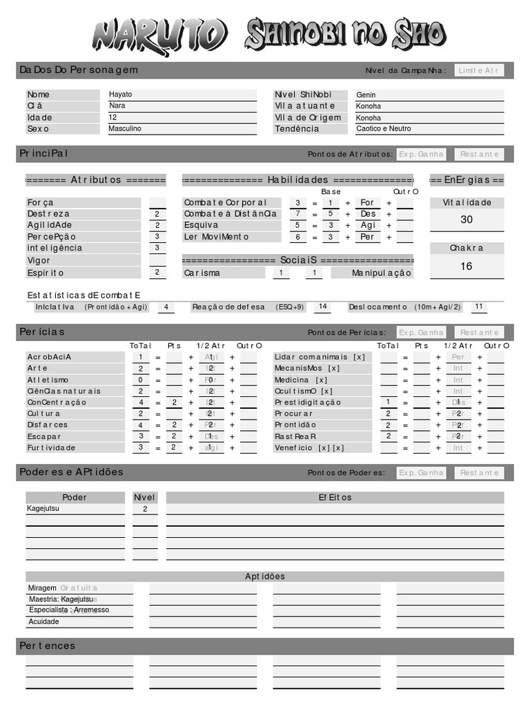 InIcIatIva (Prontidão + Agi) 4 Reação de defesa (ESQ +9) 14 Deslocamento (10m + Agi/2) 11