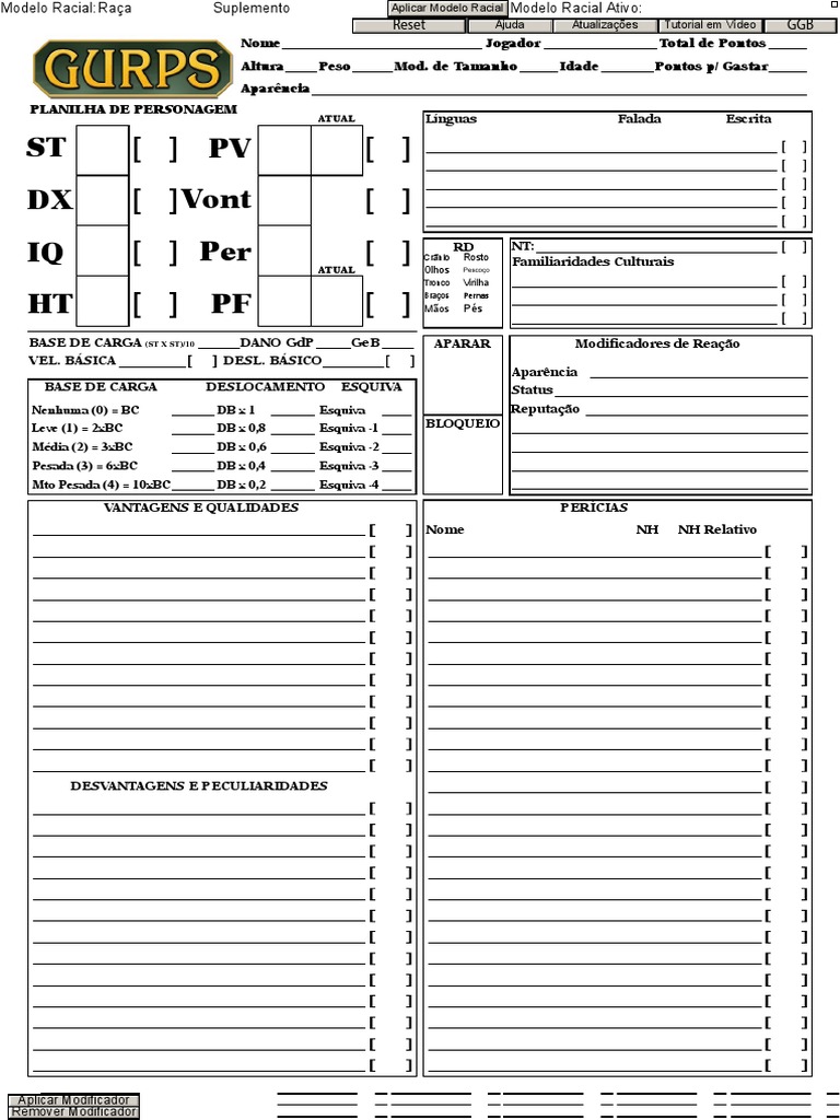 Versão 3.4A. Tiago Sliachticas © 2011, 2012,2013,2014, 2015, 2016. sliachticas@[Link]. Este arquivo deve ser distribuido gratuitamente, ficando previamente autorizada a sua disponibilização para download em quaisquer site ou blog de RPG. GURPS © 2004 Steeve Jackson Games Incorporated. [Link].
