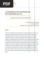 O Joelho possui uma das articulaes mais complexas e tambm a maior do corpo, portanto suportada e estabilizada por msculos e ligamentos e freqentemente exposta a traumas severos. As estruturas que formam a articulao do joelho so o fmur, a tbia e a patela. Essas estruturas sseas formam duas articulaes distintas, que so a patelofemoral e a tibiofemoral. Todavia, funcionalmente essas duas articulaes no podem ser sempre consideradas separadamente, pois existe uma relao mecnica entre elas. A leso do ligamento cruzado anterior pode estar associada a leses dos ligamentos colaterais e dos meniscos, sobretudo nos casos em que produz uma rotao de tronco em relao s extremidades inferiores. Em casos de leses meniscais associadas, a reparao do menisco isoladamente, muitas vezes leva ao fracasso, recomendando-se ento, que o ligamento cruzado anterior tambm seja tratado cirurgicamente para a estabilizao da articulao. O objetivo da cirurgia de reconstruo do LCA receber o limite normal de movimentao do joelho, voltar a estabilidade e a amplitude de movimento completa. Os programas de reabilitao ps-reconstruo do LCA tm sofrido inmeras modificaes ao longo dos anos. O sucesso de uma reconstruo do LCA extrapola o ato cirrgico, e depende tambm dos procedimentos utilizados na reabilitao psoperatria sendo, portanto, a fisioterapia uma continuao lgica do ato cirrgico. Existem vrios protocolos de tratamento propostos, o que importante observar a gravidade da leso, leses associadas, idade do paciente, nvel de atividade esportiva anterior a leso e disponibilidade do paciente para seguir um programa teraputico. importante respeitar a individualizao do paciente para que haja sucesso no tratamento fisioterpico, orientar o paciente aps a liberao para as atividades dirias e esportivas.