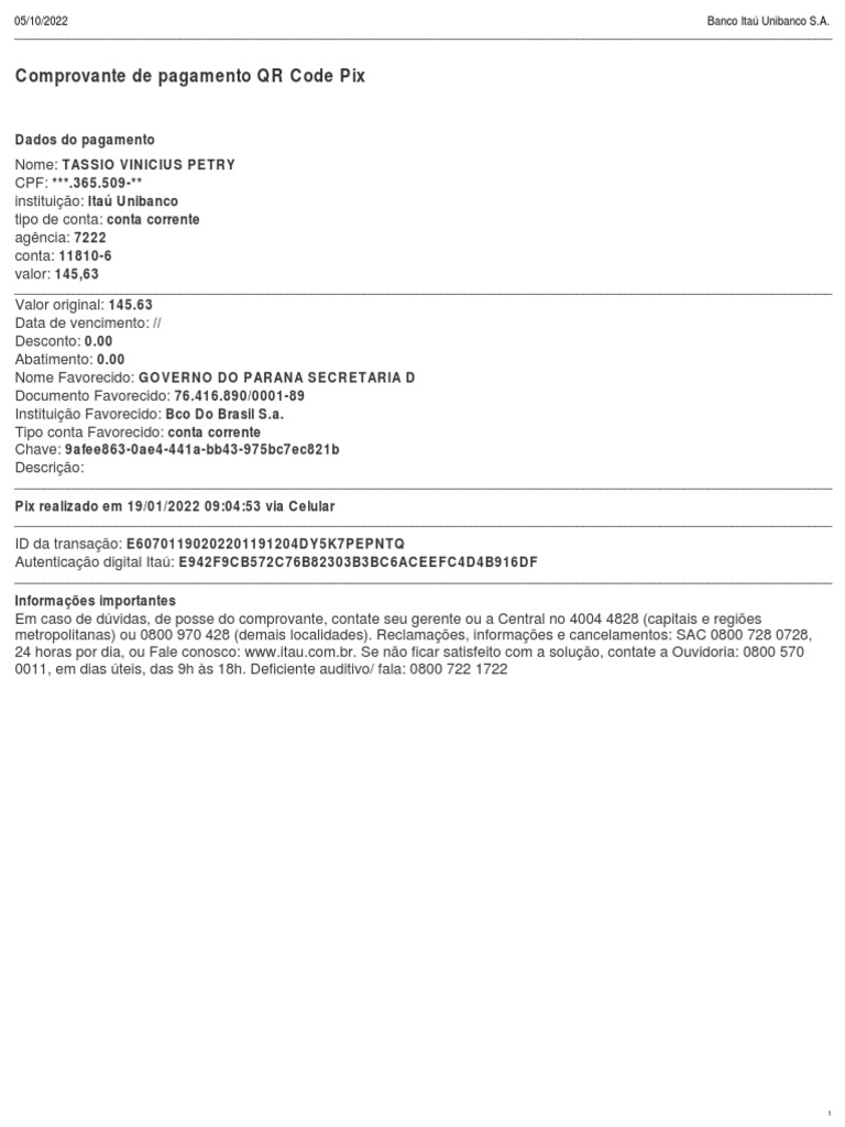 Comprovante de pagamento QR Code Pix