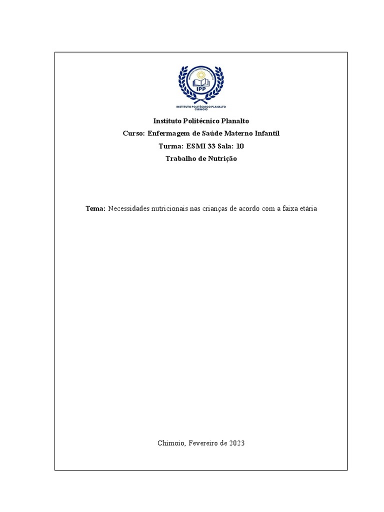 Tema: Necessidades nutricionais nas crianças de acordo com a faixa etária