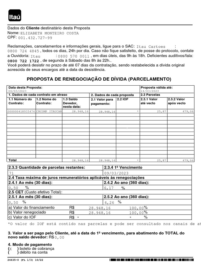 O Banco Itaucard S/A (Credor) propõe, sem intenção de novar,