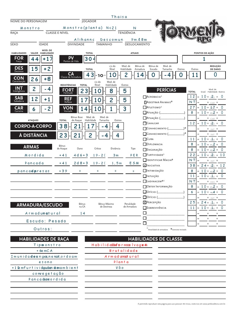 Mordida +41 4d6+34 19-20 3m PER Furtividade 22 = 10 + DES