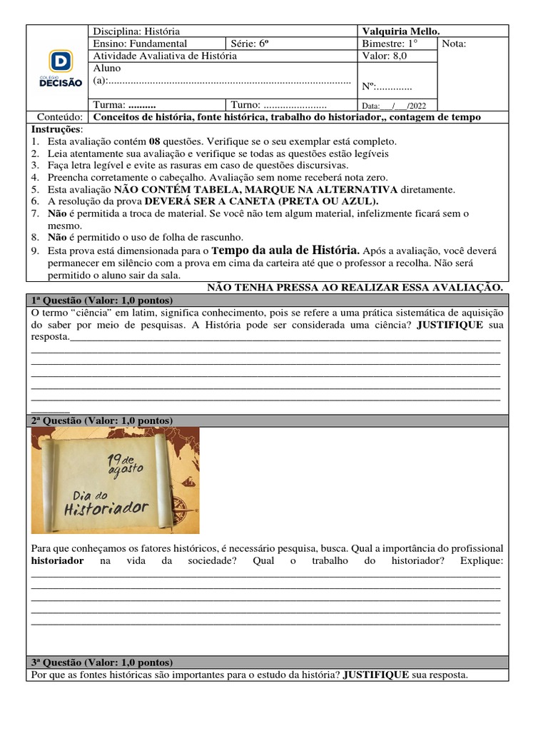9. Esta prova está dimensionada para o Tempo da aula de História. Após a avaliação, você deverá