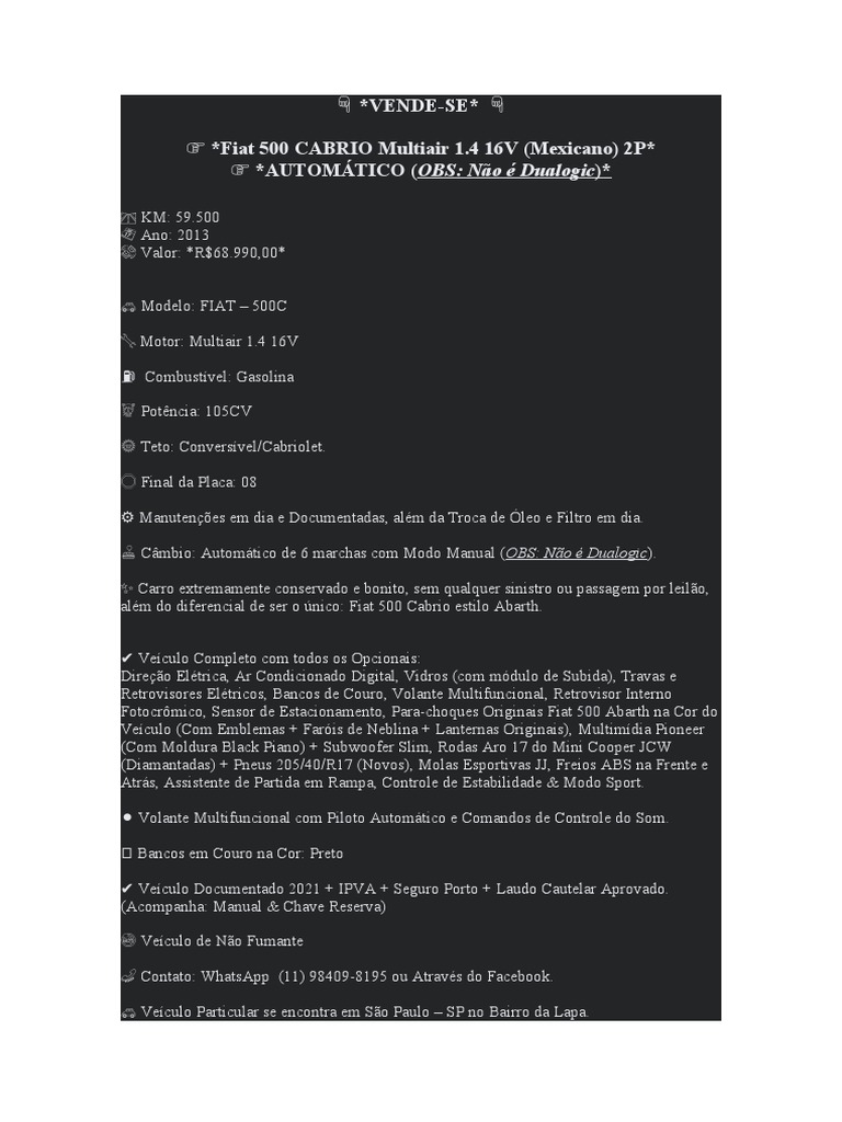 📞 Contato: WhatsApp (11) 98409-8195 ou Através do Facebook.