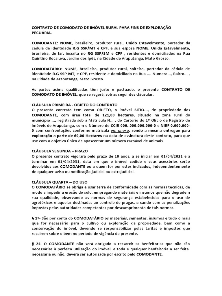 CONTRATO DE COMODATO DE IMÓVEL RURAL PARA FINS DE EXPLORAÇÃO
