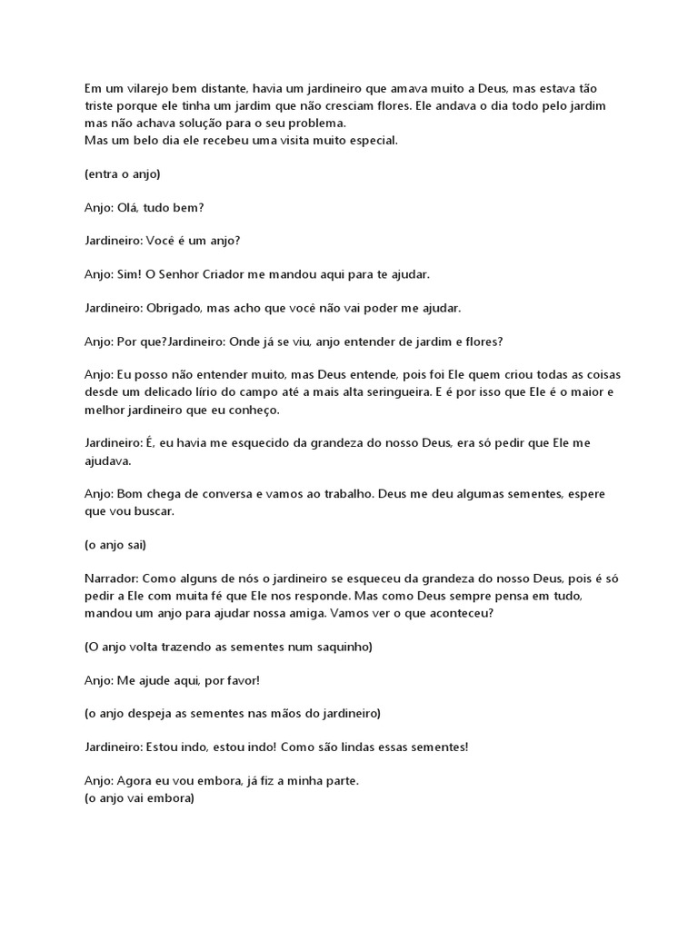 Jardineiro: Até mais seu anjo! Agora vou cuidar das minhas filhas, preparar a terra, regar,