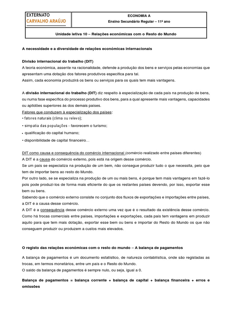 Unidade letiva 10 – Relações económicas com o Resto do Mundo