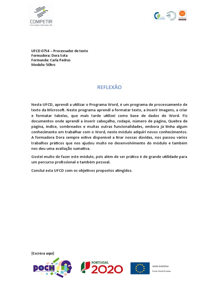 texto da Microsoft. Neste programa aprendi a formatar texto, a inserir imagens, a criar