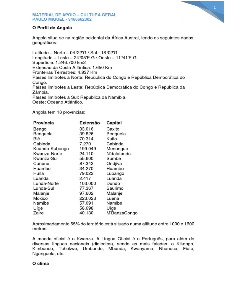 Angola situa-se na região ocidental da África Austral, tendo os seguintes dados