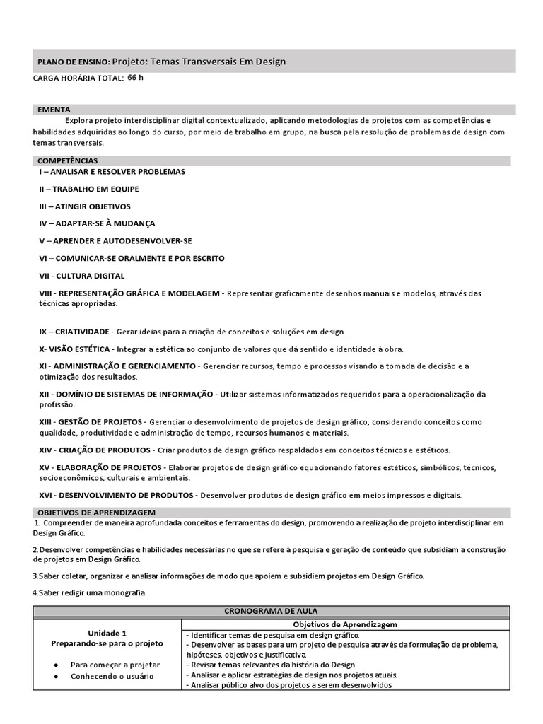 PLANO DE ENSINO: Projeto: Temas Transversais Em Design