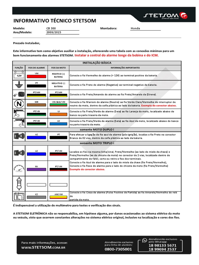 A STETSOM ELETRÔNICA não se responsabiliza, em hipótese alguma, por danos ocasionados ao sistema elétrico da moto