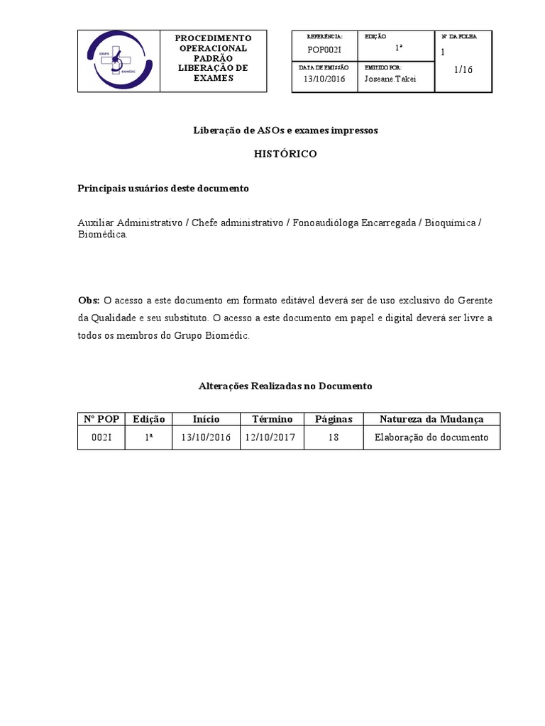 Neste documento deve conter a assinatura de quem liberou os exames no sistema Biosystem e