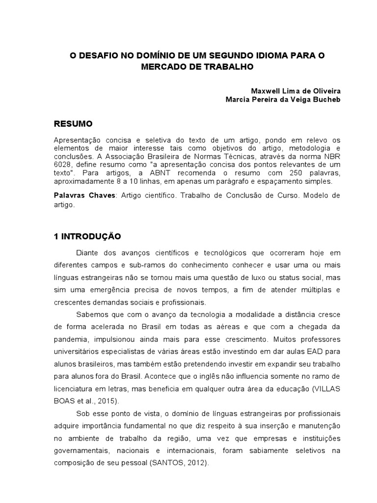 Palavras Chaves: Artigo científico. Trabalho de Conclusão de Curso. Modelo de