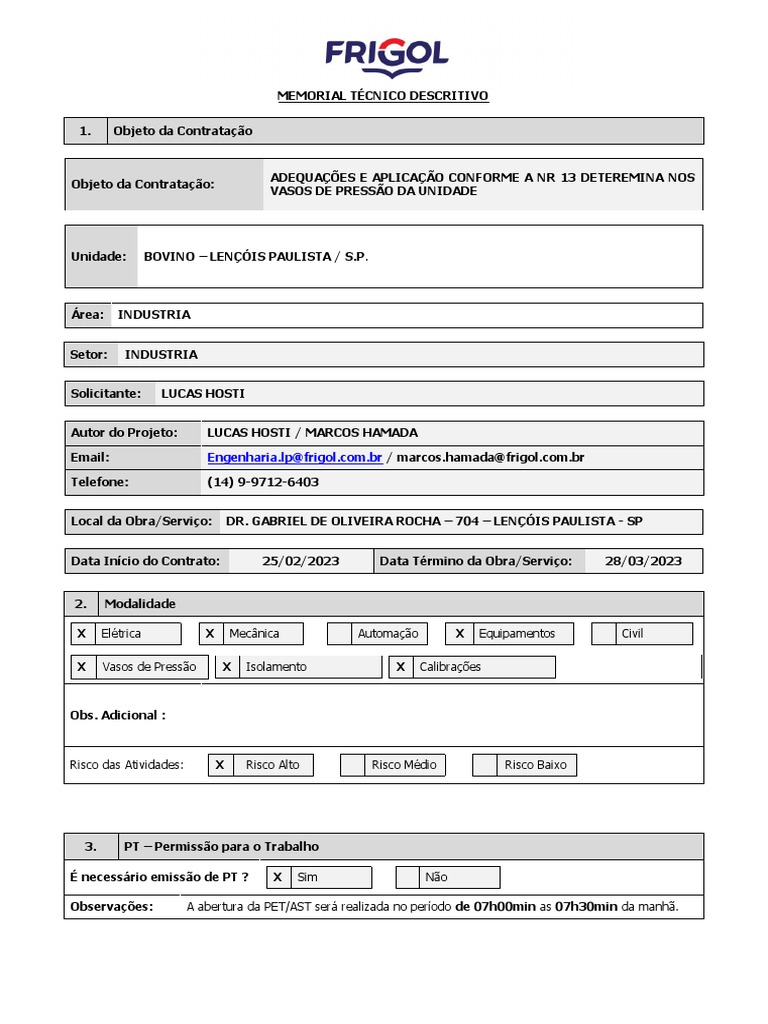 Caldeiras, Vasos de Pressão, Tubulações e Desenhos. Estas informações deverão ser disponibilizadas pela Contratante no início