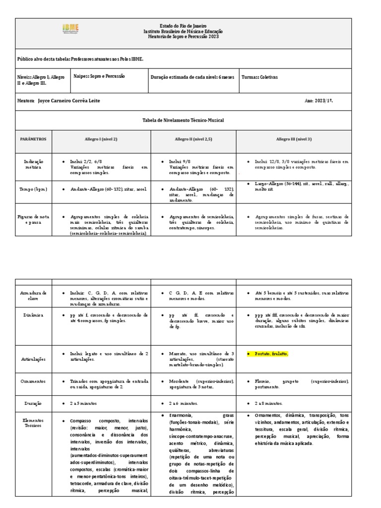 Níveis: Allegro I; Allegro Naipes: Sopro e Percussão Duração estimada de cada nível: 6 meses Turmas: Coletivas