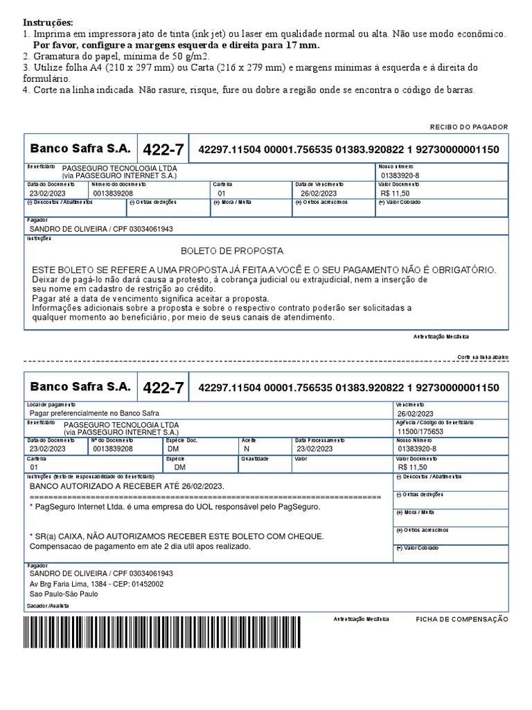 Pagar preferencialmente no Banco Safra 26/02/2023