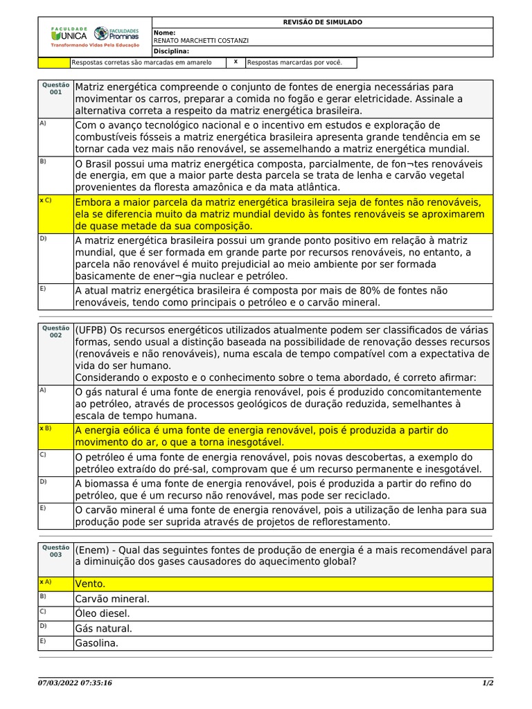 Respostas corretas são marcadas em amarelo X Respostas marcardas por você.