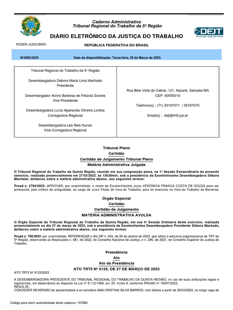 Eletrônico DEJT, edição nº. 3662/23, Caderno do TRT 5ª Região Administrativo, em 13 de fevereiro de 2023
