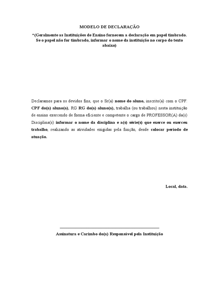 *(Geralmente as Instituições de Ensino fornecem a declaração em papel timbrado.