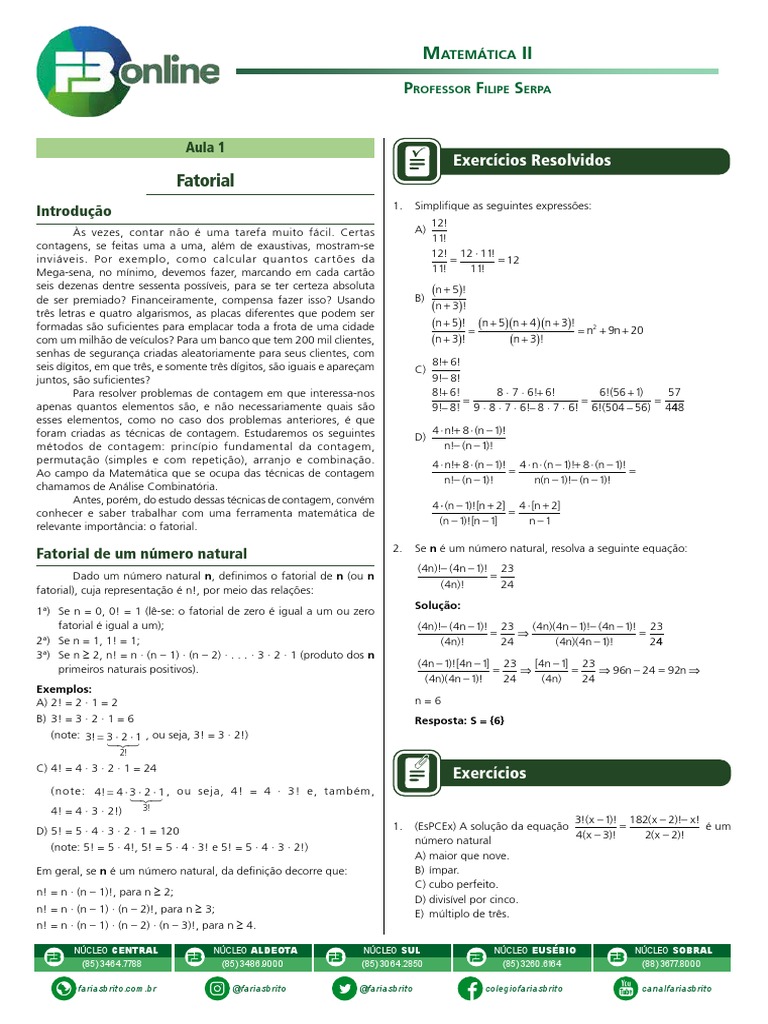 formadas são suficientes para emplacar toda a frota de uma cidade (n + 5)! = (n + 5) (n + 4) (n + 3)! = n2 + 9n + 20