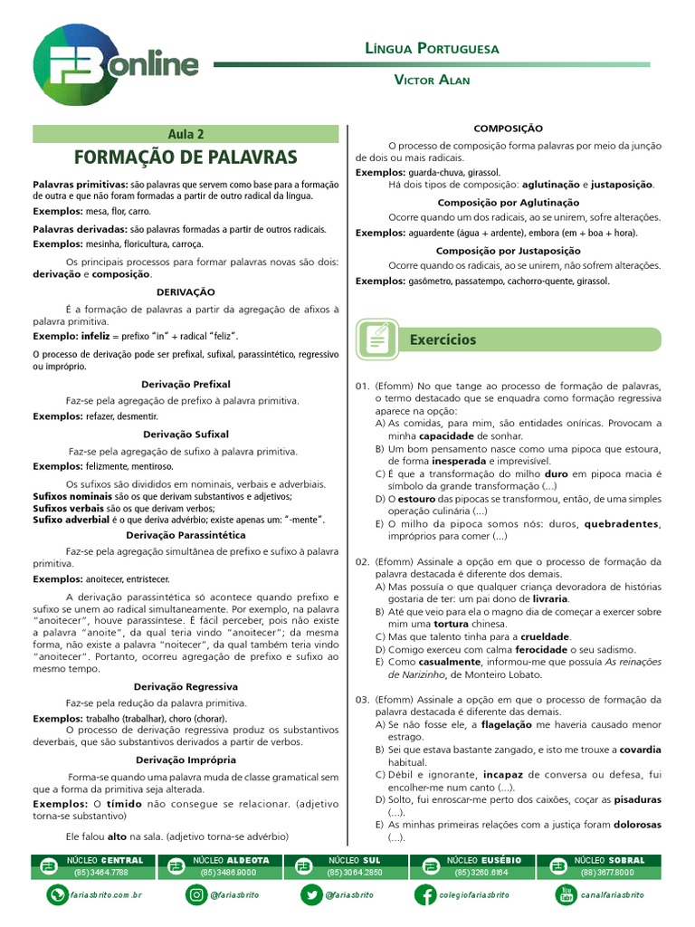 Faz-se pela redução da palavra primitiva. 03. (Efomm) Assinale a opção em que o processo de formação da