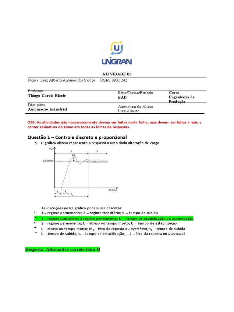 a) O gráfico abaixo representa a resposta a uma dada alteração de carga.