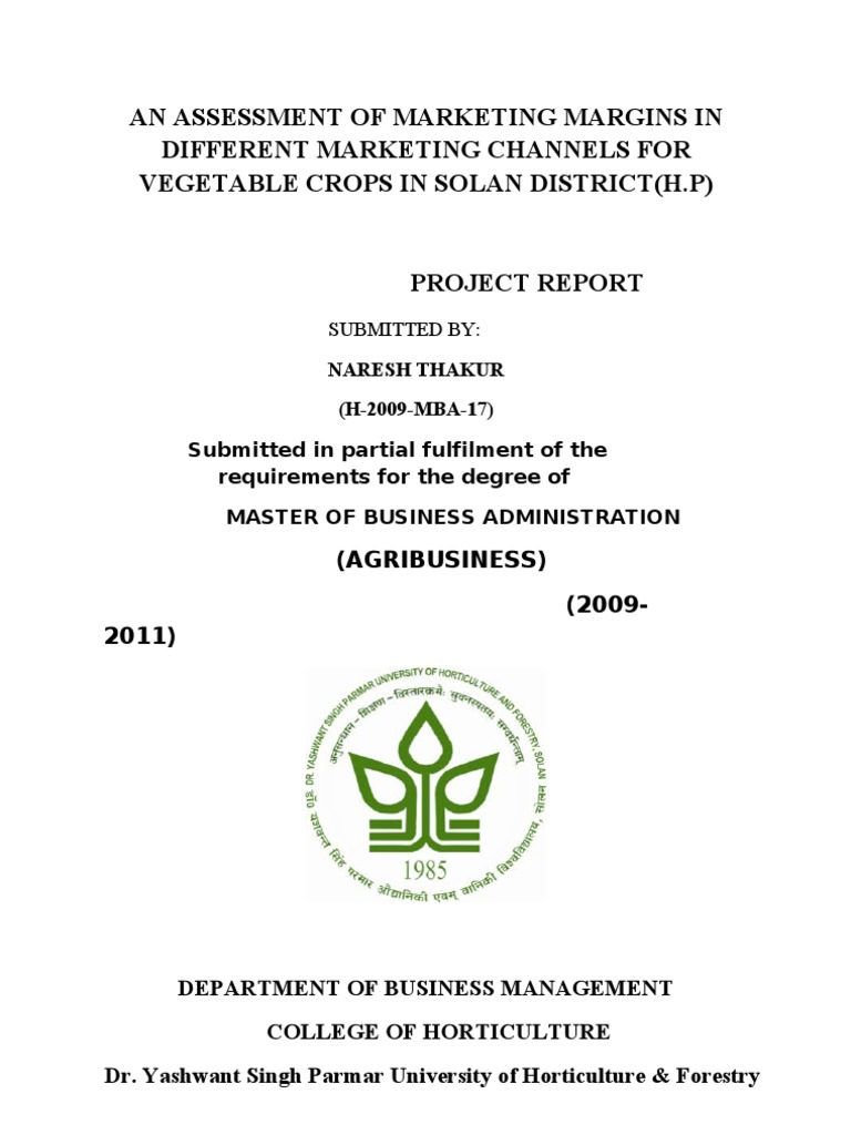 This is to certify that the project entitled An Assessment of Marketing Margins in different Marketing Channels for Vegetable Crops in Solan District (H.P.) has been submitted to Dr. Yashwant Singh Parmar University of Horticulture and Forestry, Nauni, Solan (H.P.) by Naresh Thakur (H-2009-MBA-17) in partial fulfilment of Master of Business Administration (Agribusiness) programme. This project has been done under my guidance and no part of this work has been submitted for any other degree or diploma. The assistance and help received during the course of investigation and source of literature has been fully acknowledged.