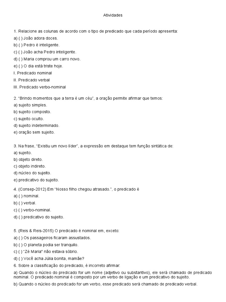 6. Sobre a classificação do predicado, é incorreto afirmar:
