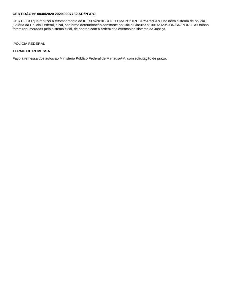 judiária da Polícia Federal, ePol, conforme determinação constante no Ofício Circular nº 001/2020/COR/SR/PF/RO. As folhas