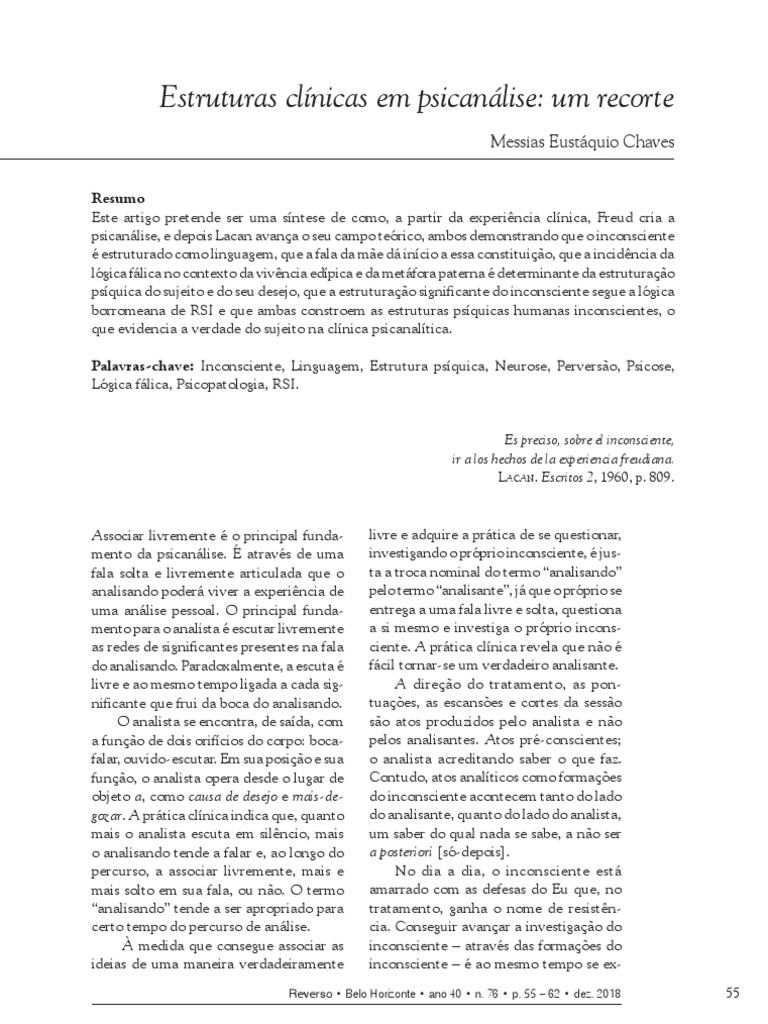 Palavras-chave: Inconsciente, Linguagem, Estrutura psíquica, Neurose, Perversão, Psicose,