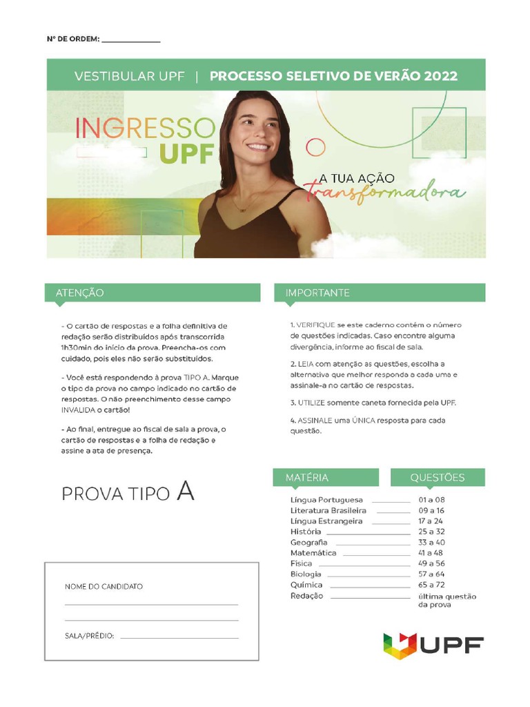 Vestibular de Verão 2022 - UPF: Prova Tipo A - P. 1