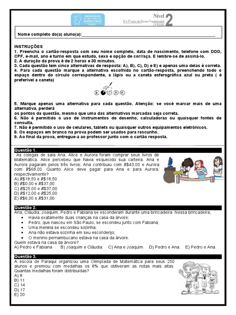 3. Cada questão tem cinco alternativas de resposta: A), B), C), D) e E) e apenas uma delas é correta.