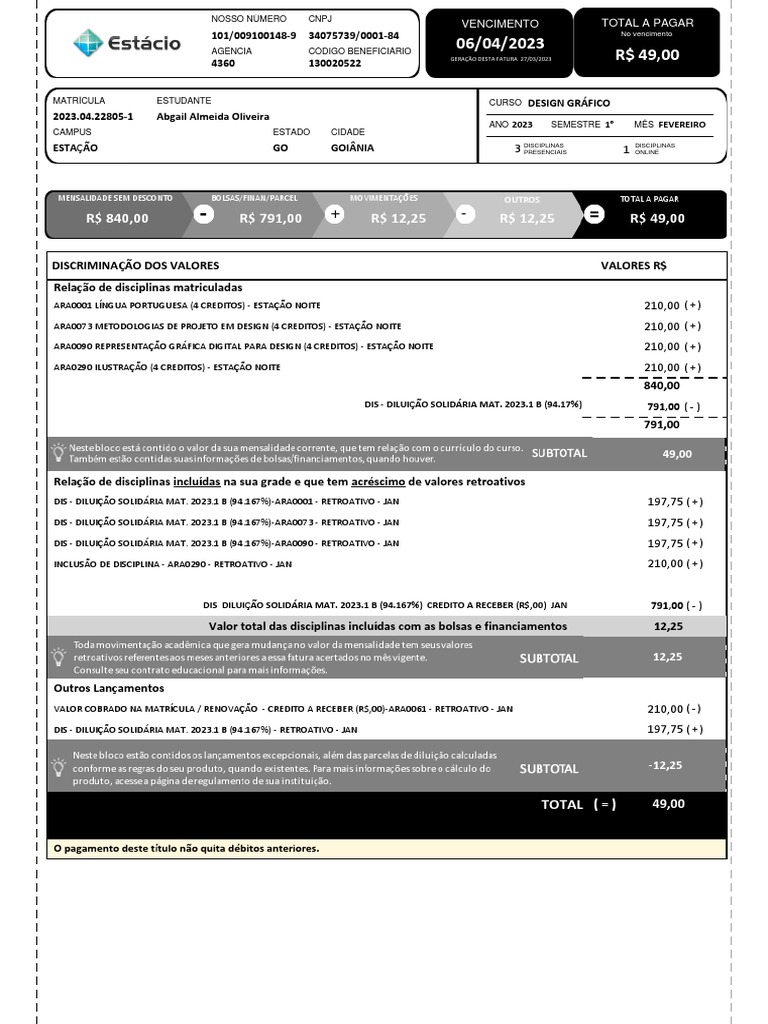 MENSALIDADE SEM DESCONTO BOLSAS/FINAN/PARCEL MOVIMENTAÇÕES OUTROS TOTAL A PAGAR