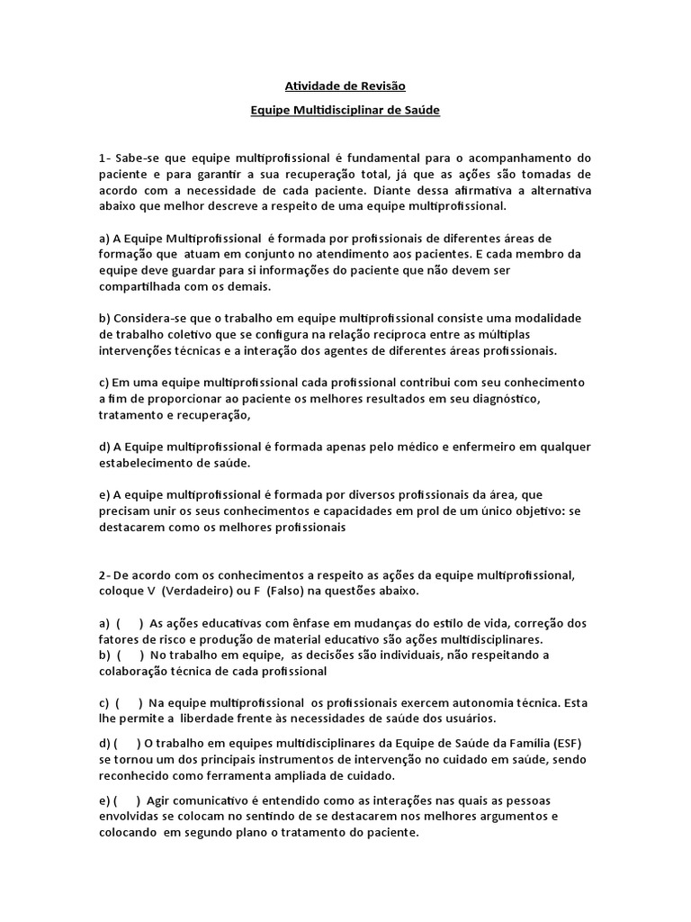 f) ( ) O trabalho das equipes multidisciplinares é pautado no atendimento integral,
