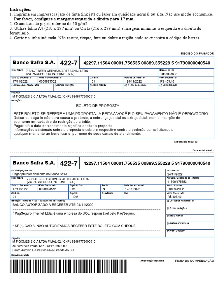 Pagar preferencialmente no Banco Safra 24/11/2022