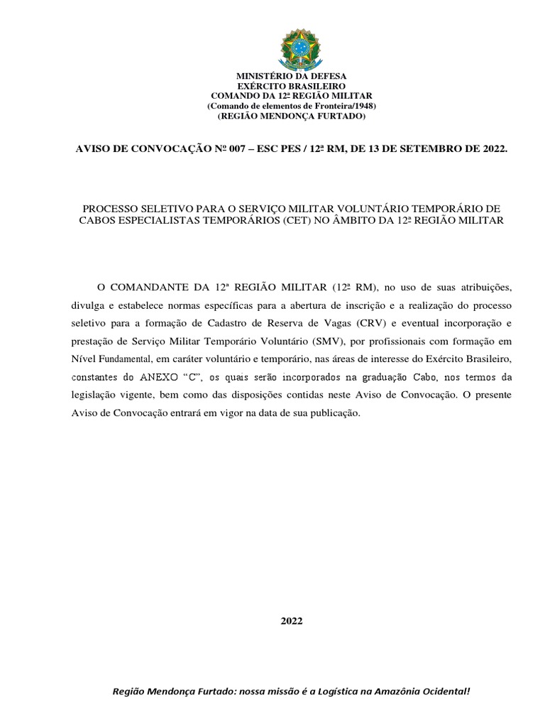 Aviso de Convocação N° 007 – CET – 2022/2023 – ESC PES / 12ª RM, de 13 SET 22…..............Página 2 de 58