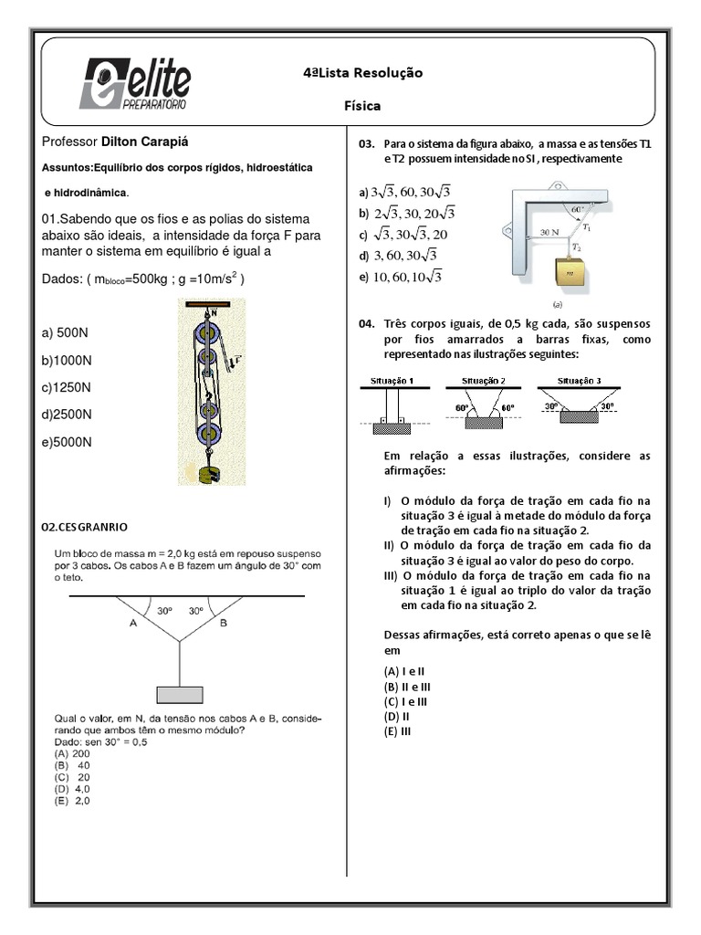 Professor Dilton Carapiá 03. Para o sistema da figura abaixo, a massa e as tensões T1