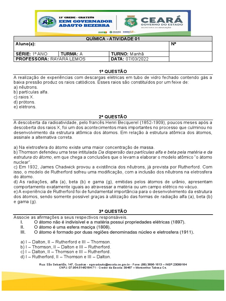 considerando o modelo atômico proposto por: