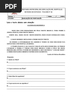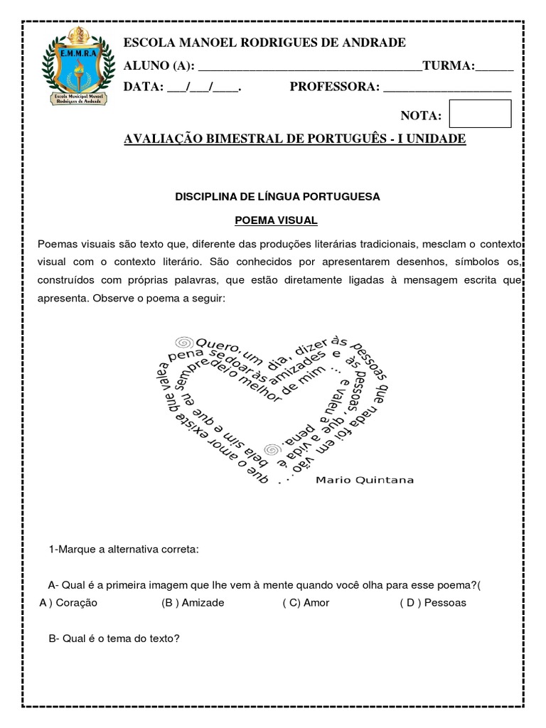 AVALIAÇÃO BIMESTRAL DE PORTUGUÊS - I UNIDADE