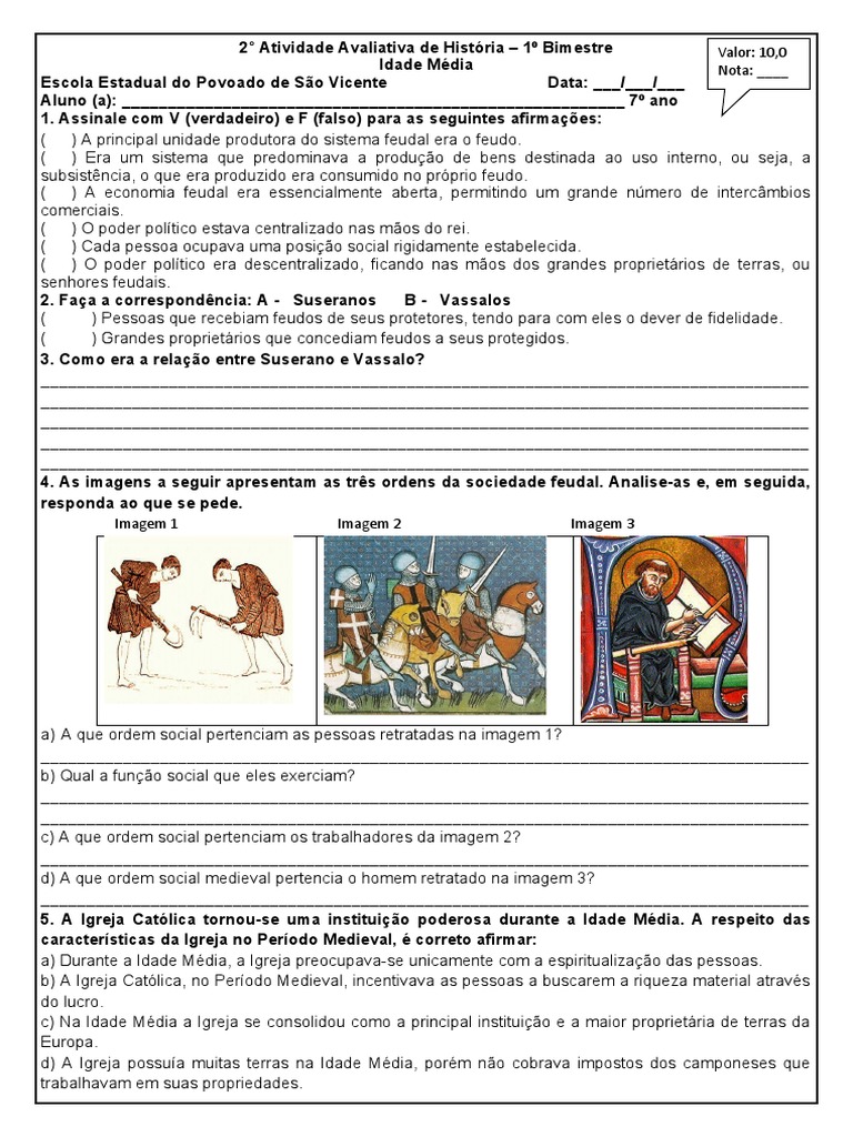 2° Atividade Avaliativa de História – 1º Bimestre Valor: 10,0