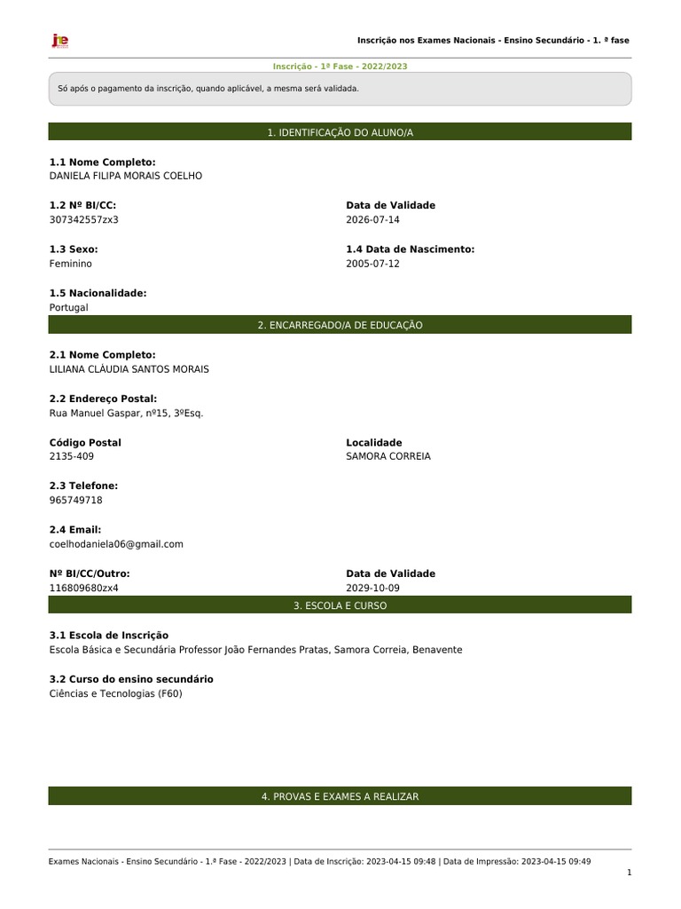 Exames Nacionais - Ensino Secundário - 1.ª Fase - 2022/2023 | Data de Inscrição: 2023-04-15 09:48 | Data de Impressão: 2023-04-15 09:49