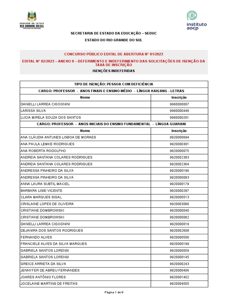 EDITAL Nº 02/2023 – ANEXO II – DEFERIMENTO E INDEFERIMENTO DAS SOLICITAÇÕES DE ISENÇÃO DA